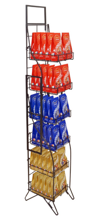 This wire floor standing rack has 6 shelves & is easy to move throughout your store to use in high impulse sale areas.