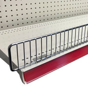 Wire fencing snaps into perforations on top of gondola retail store shelves for a secure and organized look.