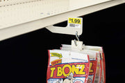 Merchandising Strip Hangers- Under-Shelf Mount securely hangs double-sided strips without interfering with product on shelf.
