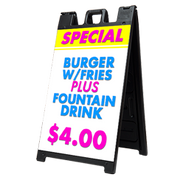 This outdoor sandwich board is great for supermarkets & other retail stores. It holds two pieces-24" W x 36"H signs.