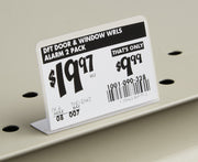 Simple "stick-on" tag attaches to the edge or underside of shelves/tables. Just fold along the score line, remove the tape liner and press into place.