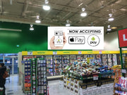 This Apple Pay-Google Pay retail sale event hanging sign-ceiling dangler will inform your customer of payment options.