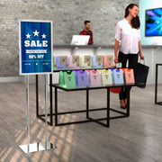 This Floor Stand -Stanchion Sign Holder for 14"W x 22"H signs. Perfect for any retail setting- including department stores, supermarkets, specialty stores, drug, banks, hotels or hospitals.