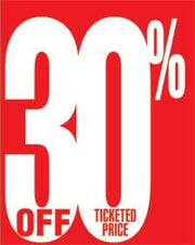 This 30% off Ticketed price poster-sign is great for seasonal inventory reduction or store closings.. Use other percentage off signs to post further reductions each week.