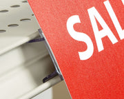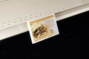 This sign holder securely mounts a variety of signs, coupon books-boxes or lightweight displays to shelf price channels. Also known as Advertiser Rail Clips.