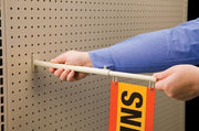The 1" on center base prongs are designed to securely fit into most standard pegboard holes. Removable and reusable. This telescopic hanging sign holder captures customer attention with aisle signage.