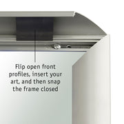 The spring loaded hinged profiles let you snap open the frame, insert your signage, and then snap the frame closed, all without having to take the frame off of the wall.